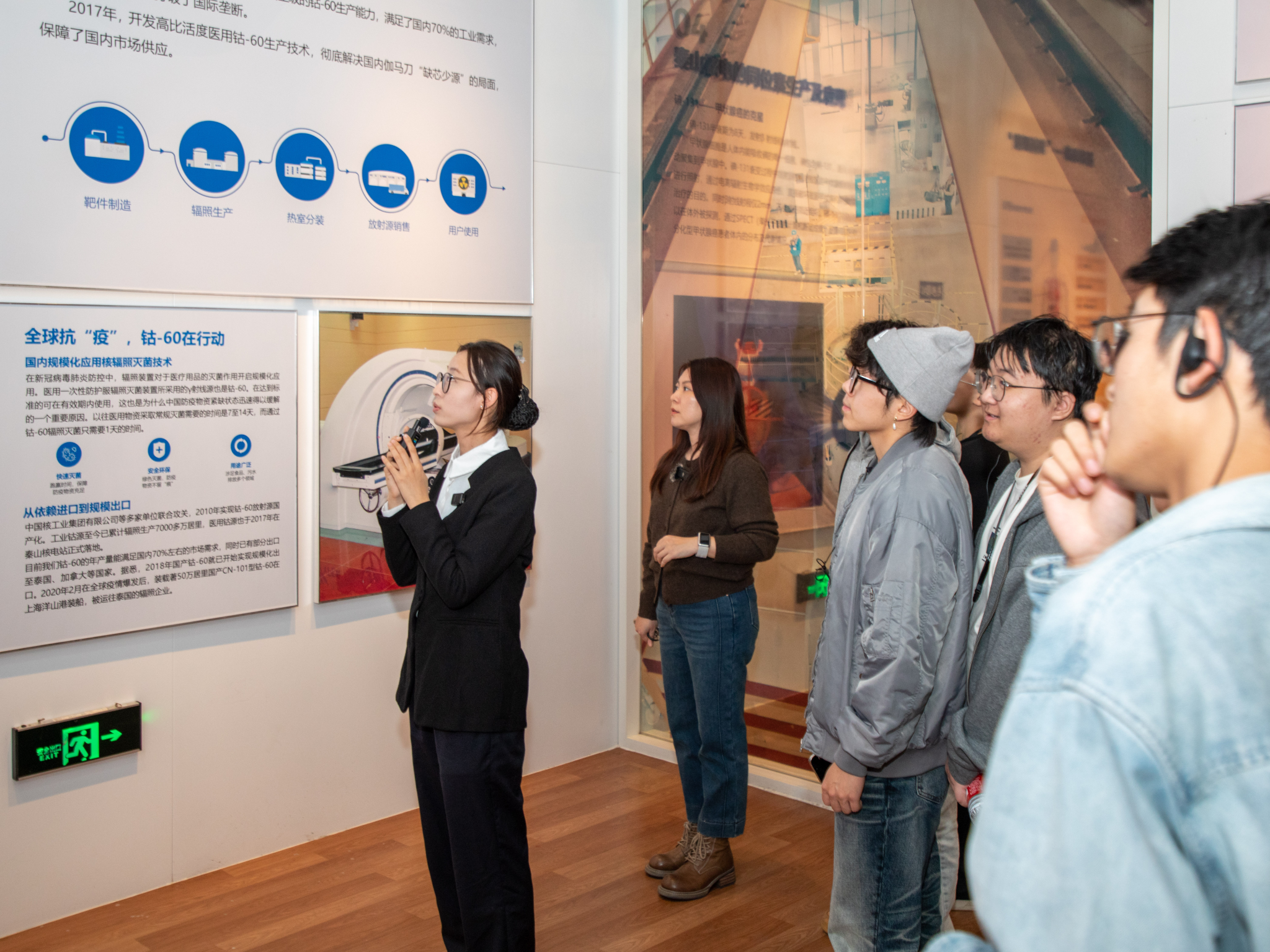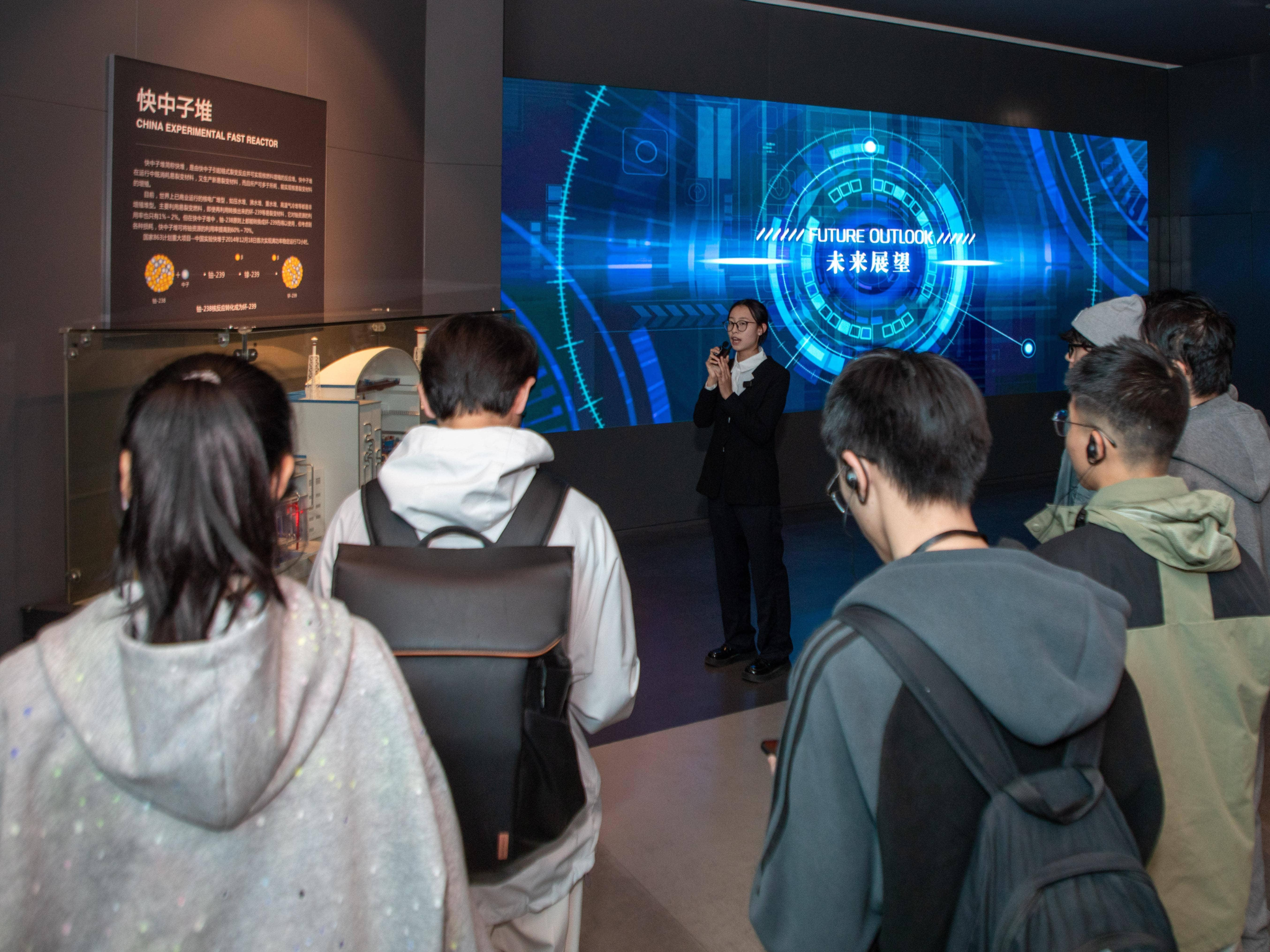 在秦山核电科技馆讲解员的引导下,师生们开启了一场沉浸式的探寻中国核电发展史的“科技之旅”。馆内丰富的历史文物、精美的模型和先进的互动体验设施,全方位、多角度地生动展现了中国核电从起步到腾飞的奋斗历程。师生们驻足于秦山核电站一期模型前,聆听“中国核电从这里起步”的创业故事;在核能知识科普区,通过生动有趣的互动装置,深入了解了核能发电的原理、安全性以及核技术在医疗、农业等领域的广泛应用。同学们深刻感受到,核电强国的梦想正是在科研团队分秒必争、攻坚克难中逐步实现的。在未来核电展区,同学们在讲解员的介绍中更是体会到,作为安全、清洁、高效的绿色能源,核电孕育着无限的未来。随着科学技术不断进步,尤其是当可控核聚变技术获得突破时,人类有望彻底解决能源问题。