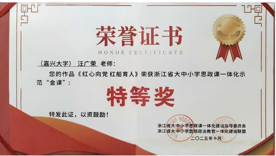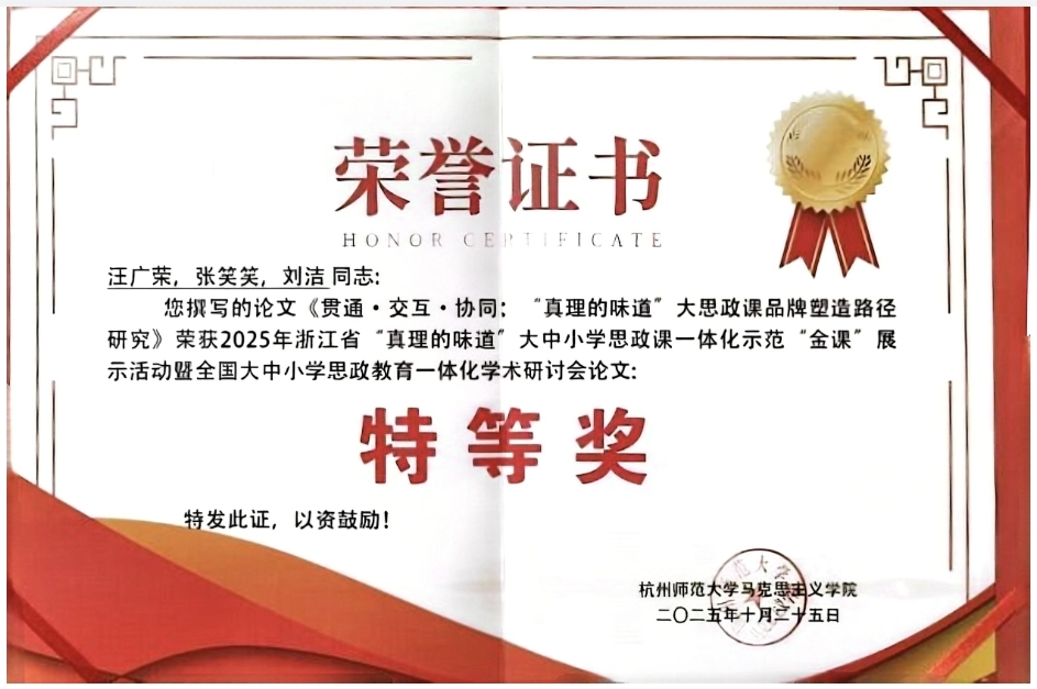 10月25日,浙江省“真理的味道”大中小学思政课一体化示范“金课”展示活动暨全国大中小学思政教育一体化学术研讨会在杭州举行,评选出“金课”特等奖4项、研讨会论文特等奖3项,我院课程、论文双双获得特等奖。其中大中小学思政课一体化课程“红心向党 红船育人”荣获浙江省“真理的味道”大中小学思政课一体化示范“金课”特等奖,论文《贯通·交互·协同:“真理的味道”大思政课品牌塑造路径研究》荣获全国大中小学思政教育一体化学术研讨会论文特等奖。